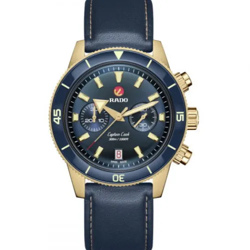 Die Captain Cook Chronograph zeichnet sich durch ein charakteristisches kratzfestes Saphirglas im Box-Shape-Stil mit beidseitiger Antireflexionsbeschichtung aus. Das dünne, stylische 43 mm grosse Gehäuse aus gebürsteter Bronze verfügt über ein Lünetten-Inlay aus polierter blauer …Hightech-Keramik – das perfekte Gegenstück zum blauen Zifferblatt mit Sonnenschliff. Die Ziffern, Markierungen und Dreiecke der Uhr sind mit Super-LumiNova® behandelt. Im Inneren übertrifft das neue dünnere, in 5 statt 3 Lagen getestete R801 Automatikwerk mit 37 Steinen, 5 Zeigern und einer Gangreserve von 59 Stunden dank einer nicht-magnetischen NivachronTM Spiralfeder die Standardtestanforderungen und sorgt für eine höhere Genauigkeit. Geliefert wird das Modell mit einem Textilarmband mit goldfarbenem Mittelstreifen sowie einem blauen Lederarmband und einem zusätzlichen Textilarmband in Ultramarinblau.