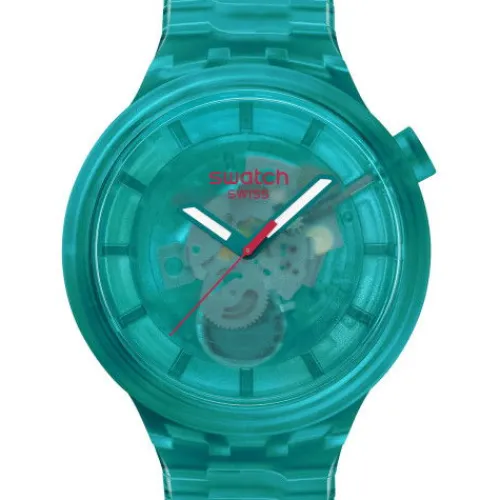 Das türkisfarbene Modell im Oversize-Format besticht durch seinen durch und durch transparenten Look – vom biobasierten Gehäuse, Zifferblatt und Lünette bis hin zum biobasierten Armband mit Doppelfaltschliesse. Das transparente türkisfarbene Zifferblatt aus biobasiertem Material gibt den …Blick auf das Uhrwerk frei, während fluoreszierende türkise Stunden- und Minutenzeiger und ein kontrastierender pinkfarbener Sekundenzeiger unter dem biobasierten Glas die Zeit anzeigen.