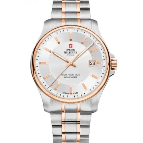 Getreu unserem Konzept der Swiss Made Uhrenherstellung sind das Gehäuse und das Armband dieser klassischen Bicolor-Uhr aus robustem Edelstahl gefertigt. Ein kratzfestes Saphirglas schützt das silberne Zifferblatt. Alle Stundenmarkierungen sowie der Stunden- und Minutenzeiger leuchten im Dunkeln. Diese klassische Herrenuhr wird von einem hochpräzisen Swiss Made Quarzuhrenwerk angetrieben und in unserem hauseigenen Uhrmacheratelier von Hand assembliert. Als Versprechen unserer Swiss-Military-Swiss-Made-Qualität gilt für diese Uhr eine internationale Garantie von 5 Jahren.