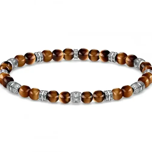 Auf die wichtigen Dinge im Leben konzentrieren – daran erinnert das Armband aus polierten Tigerauge-Beads in den Farben von Wüste und Erde, die mit ihrer Maserung für individuelle Lebenslinien stehen. Die Steinkugeln wechseln sich mit verzierten Silberelementen ab. Diese sind in vier …unterschiedlichen Formen und Mustern im ikonischen THOMAS SABO Rebel at heart Stil aus geschwärztem 925er Sterlingsilber gestaltet.