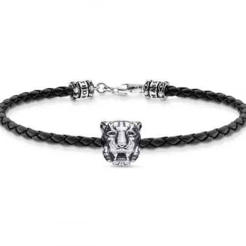 Das Armband ist aus schwarzem, geflochtenem Nappaleder gefertigt. Sein Highlight ist ein dreidimensionaler Tigerkopf-Bead mit schwarz funkelnden Zirkonia-Augen. Er ist mit einem feinen, charakteristischen Streifenmuster verziert und aus hochwertigem, geschwärztem 925er Sterlingsilber gestaltet. …Aus dem gleichen Material ist der Karabinerverschluss mit THOMAS SABO Branding, der den edlen Mix aus 925er Sterlingsilber und schwarzem Nappaleder perfekt ergänzt.