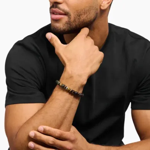 Lass dich von der Mystik des Tigerauges in seinen Bann ziehen. Es steht für Schutz, Mut, Balance und Bodenständigkeit. In 2 faszinierenden Farbvarianten begeistert der bedeutungsvolle Stein bei diesem Armband. 9 mm große, matte Tigerauge-Beads in Goldbraun und polierte Tigerauge-Beads in …Blaugold reihen sich harmonisch aneinander. Für einen eleganten Twist sorgt der Logo-Ring mit THOMAS SABO Gravur aus recyceltem und geschwärztem Silber.
