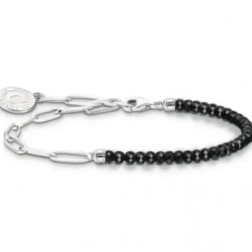 Charm-Carrier: Das Charm-Armband besitzt eine spannende Optik. Es kombiniert ein Gliederarmband in Langankerketten-Optik aus hochwertigem 925er Sterlingsilber mit einem Beads-Armband aus Onyx. Die Endkappen des Stein-Armbands sind mit Gravurlinien aufwendig gestaltet. Das Ende des Gliederarmbands …ziert eine runde, gravierbare THOMAS SABO Charm Club Charmista Coin. Sie ist von Hand mit schimmernder Kaltemaille in Weiß bemalt.
