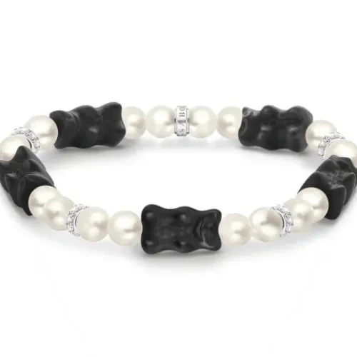 Die fröhliche Welt der THOMAS SABO x HARIBO Kollektion: Mit diesem Perlenarmband tauchst du spielendleicht in sie ein. Geschmückt mit 5 schwarzen HARIBO Goldbären, verbreitet es sofort gute Laune und weckt Kindheitserinnerungen. Aus leicht satiniertem Kristallglas in Schwarz sind die berühmten …Goldbären neu interpretiert und verbinden als Hingucker das klassische Armband aus Süßwasserzuchtperlen und Elementen mit weißen Zirkonia-Steinen mit Zeitlosigkeit und Popkultur. Trage es mit einem Augenzwinkern und als perfektes Accessoire deines Y2K-Looks – einzeln oder in Kombination mit weiteren Schmuckstücken der Kollektion.