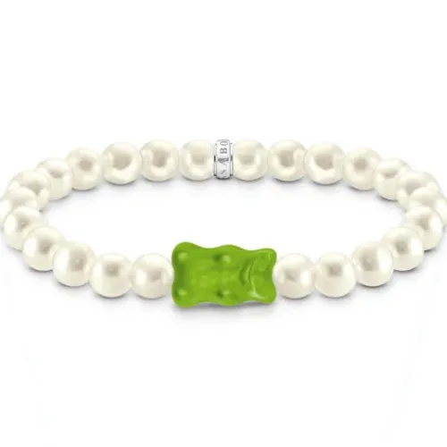 Süßes für dein Handgelenk – aber Vorsicht: bitte nicht naschen ;-). Ein täuschend echt gestalteter HARIBO Goldbär in Grün schmückt dieses elegante Perlenarmband. Er ist aus leicht satiniertem Kristallglas in einer bruchsicheren, hochwertigen Qualität gefertigt und auf der Rückseite mit …THOMAS SABO x HARIBO graviert. Mit einem Augenzwinkern verleiht er dem Armbandklassiker einen niedlichen Twist und weckt Erinnerungen an die Kindheit. Bist auch du ein Fan der beliebten Gummibärchen? Dann trage das Armband aus Süßwasserzuchtperlen als Statement und kombiniere es mit weiteren Schmuckstücken aus der THOMAS SABO x HARIBO Kollektion.