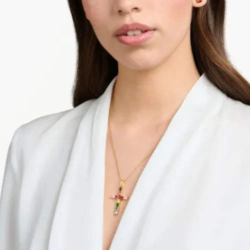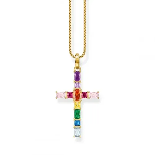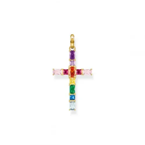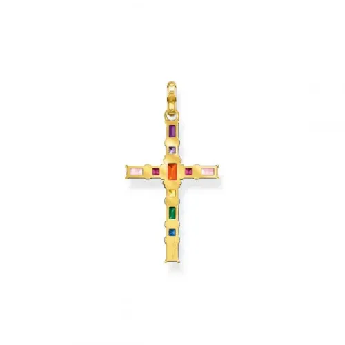 In Regenbogen-Farben funkelt der Kreuz-Anhänger aus hochwertigem 925er Sterlingsilber mit edler 750er Gelbgold-Vergoldung. Er ist mit Schmucksteinen in unterschiedlichen Größen in vielen bunten Farben von Hand besetzt. Die Steine im Prinzess- und Oktagonschliff lassen den Anhänger erstrahlen. …Dank der offenen Krappenfassung ist ihr Farbenspiel bei Lichteinfall besonders intensiv. Die Öse des Kettenanhängers ziert eine THOMAS SABO Gravur.