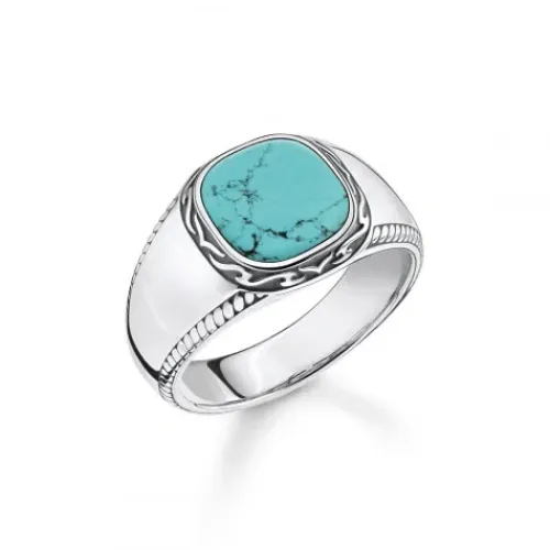 Siegelring-Klassiker in neuer Farbe: Ein glänzend poliertes, glattes und leicht eckiges Inlay aus imitiertem Türkis ziert das Schmuckstück aus hochwertigem 925er Sterlingsilber. Feine Gravuren im Tigermuster um den Ringkopf und in Kordeloptik seitlich entlang der Ringschiene verleihen dem …Siegelring eine außergewöhnliche Note. Für angenehmes Tragegefühl ist die Ringschiene innen leicht gerundet.