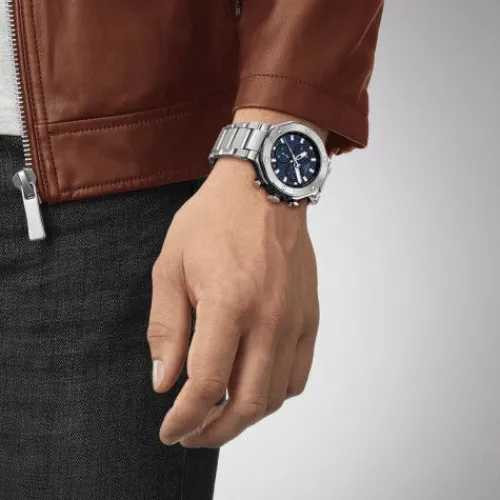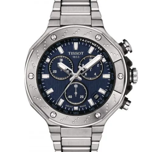 Die Tissot T-Race Chronograph ist nicht nur bei Motorradfahrern und Motorradsport-Fans sehr beliebt und gehört auch abseits der Rennstrecke zu den Gewinnern. Als sehr sportliche Uhr besitzt sie ein präzises Swiss Made Quarzwerk und ein Gehäuse aus 316L-Edelstahl mit Kronenschutz und verfügt …über zahlreiche unverkennbar vom Rennsport inspirierte Elemente, darunter die Lünette in Form einer Bremsscheibe und die an die Kühlrippen eines Motors erinnernde, eingekerbte Außenseite des Gehäuses. Kratzfestes, entspiegeltes Saphirglas schützt das Zifferblatt mit Datumsanzeige, drei markanten Chronographenzählern und Tachymeter-Skala zur Geschwindigkeitsmessung. Zeiger und Indizes sind mit SuperLuminova Leuchtmasse versehen. Diese Ausführung der Tissot T-Race Chronograph präsentiert sich mit einem 316L-Edelstahlgehäuse und blauem Zifferblatt sowie mit einem 316L-Edelstahlarmband mit Sicherheitsfaltschließe mit Drückern. Beschleunigen Sie modisch auf der Überholspur!