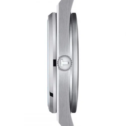 Das 316L-Edelstahlgehäuse der Tissot PRX hat einen Durchmesser von 40 mm. Es weist eine leichte Tonneau-Form auf und wird von einer schmalen, runden Lünette geziert. An den Seiten wechseln sich vertikal gebürstete, abgerundete Finishes mit polierten Facetten ab.