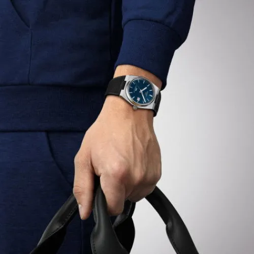 Diese Ausführung der Tissot PRX Powermatic 80 besitzt ein blaues Zifferblatt mit Indizes und ein schwarzes Kautschukarmband mit Schnellwechselsystem und Dornschließe.