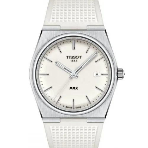 Diese Ausführung der Tissot PRX besitzt ein weißes Zifferblatt mit Indizes sowie ein weißes, strukturiertes Kautschukarmband mit Schnellwechselsystem und Dornschließe.