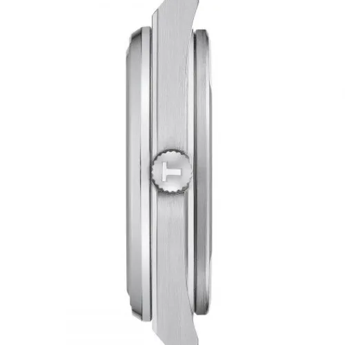 Das 316L-Edelstahlgehäuse der Tissot PRX hat einen Durchmesser von 40 mm. Es weist eine leichte Tonneau-Form auf und wird von einer schmalen, runden Lünette geziert. An den Seiten wechseln sich vertikal gebürstete, abgerundete Finishes mit polierten Facetten ab.