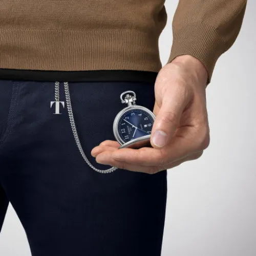 Die Tissot Savonnette Quarz Kollektion besteht aus glanzvollen Taschenuhren, die das handwerkliche Können vergangener Tage mit einem Hauch Nostalgie widerspiegeln. Diese Uhren mit Swiss Made Quarzwerk mit Batterie-Endanzeige und Datumsanzeige erinnern an die eindrückliche Geschichte und …Tradition der Uhrmacherkunst, zu der auch Tissot beigetragen hat. Dieses Modell mit 316L-Edelstahlgehäuse und Mineralglas wird mit passender Kette geliefert und besitzt ein blaues Zifferblatt mit arabischen Ziffern. Bitte beachten Sie, dass der Öffnungswinkel des Deckels der Tissot Savonnette nicht volle 90 Grad beträgt.