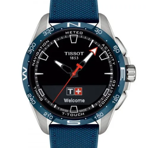 Als Nachfolger der ersten taktilen Multifunktionsuhr der Geschichte – die 1999 von Tissot auf den Markt gebrachte T-Touch – ist die jetzige T-Touch Connect Solar ein Sinnbild der Marken-Philosophie: Innovators by Tradition. Die 47 Millimeter messende Tissot T-Touch Connect Solar präsentiert …sich dank eines Titangehäuses mit Keramiklünette leicht, hypoallergen und robust. Bedient wird sie über das taktile, kratzfeste Saphirglas, eine elektronische Krone sowie 2 Drücker. Die Verbindung mit dem Smartphone erfolgt per Bluetooth und mit der im App Store, über Google Play sowie die Huawei App Gallery verfügbaren Tissot T-Touch Connect Solar App. Diese Konnektivität erlaubt die Anzeige eingehender Anrufe und aller gewünschten Benachrichtigungen auf dem energiesparenden Memory-In-Pixel Display. Regelmäßige Updates bieten Raum für sukzessive Erweiterungen des Funktionsumfangs. Sehr bewusst hybrid konzipiert, behält Tissots Innovation den Großteil ihrer Funktionalität auch ohne Verbindung zum Smartphone bei. Dazu zählen unter anderem: Activity Tracker (Schrittzähler, zurückgelegte Distanz, Kalorienverbrauch), Kompass, Barometer, Temperaturanzeige, Höhen- und Höhendifferenzmesser, zweite Zeitzone, ewiger Kalender, Countdown sowie verschiedene Stopp- und Alarmfunktionen. Durch Sonnenlicht gespeist, ist die Laufzeit der Tissot T-Touch Connect Solar im Offline-Modus quasi unbegrenzt. Im Connected-Modus erzielt sie, je nach Nutzungsverhalten des Trägers und Sonneneinstrahlung, mindestens 6 Monate Gangautonomie. Sie stützt sich hierfür auf modernste, im Zifferblatt integrierte Solarzellen, um ihren Akku, von stationärem Laden weitestgehend unabhängig, dauerhaft mit Energie zu versorgen. Das eigens in der Schweiz entwickelte „Sw-ALPS“ Betriebssystem gewährleistet die Kompatibilität mit iOS, Android und Harmony OS von Huawei. Im Rahmen der Konzeption dieser Uhr wurden ganze 35 Patente angemeldet. Die Tissot T-Touch Connect Solar ist in verschiedenen Ausführungen wie satiniertem Titan, Titan mit schwarzer PVD-Beschichtung oder Titan mit roségoldfarbener PVD-Beschichtung erhältlich sowie mit Titan-, Kautschuk- oder Silikonarmband. Diese Ausführung der Tissot T-Touch Connect Solar verfügt über ein amagnetisches Titangehäuse mit einer blauen Keramiklünette mit lumineszierenden Windrose-Markierungen. Markante, mit SuperLuminova® Leuchtbeschichtung versehene Stunden- und Minutenzeiger heben sich klar von dem schwarzen Zifferblatt ab und garantieren beste Ablesbarkeit. Das blaue Textilarmband verfügt über eine Dornschließe sowie ein Schnellwechselsystem.